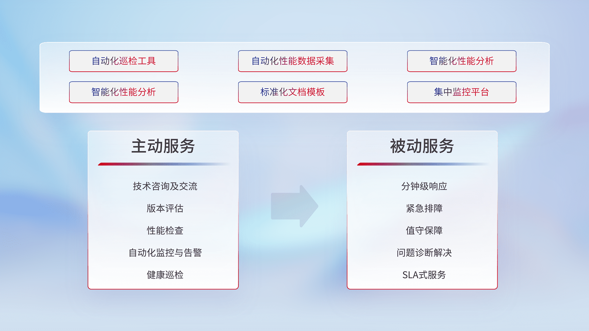 智能化工具和标准化文档,,保障服务质量,,,提供主动服务(包含技术咨询、、、版本评估、、、、性能检查、、自动化监控与告警、、健康巡检)和被动服务包含(分钟级响应、、、、紧急排障、、值守保障、、、、问题诊断解决、、SLA服务)。。。